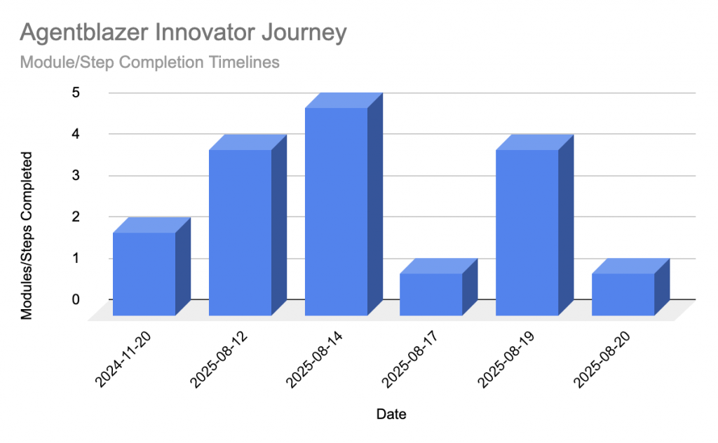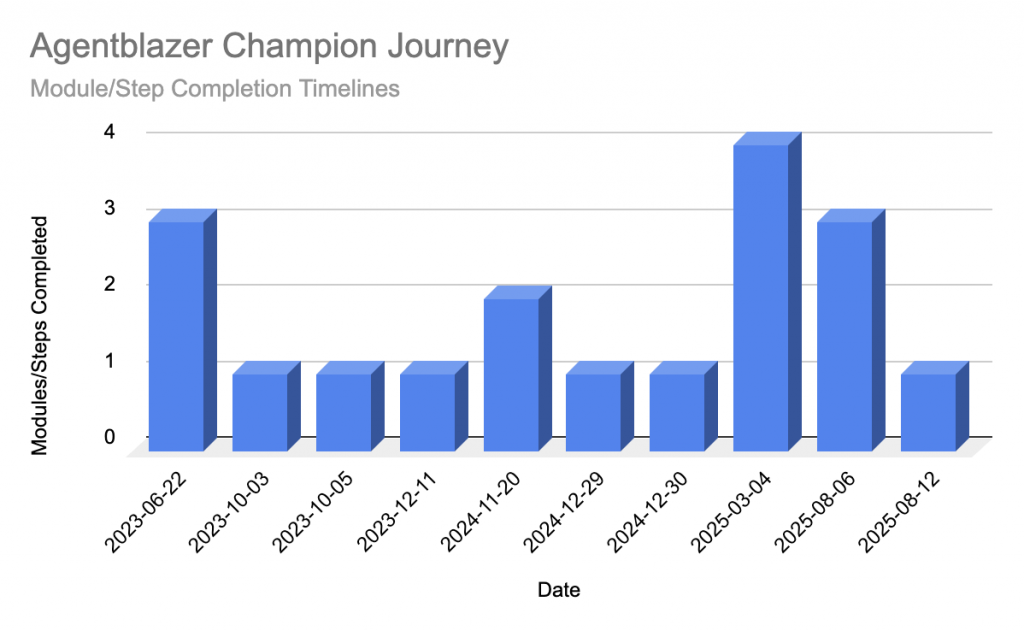 • The Agentblazer Champion path spanned from 2023 to 2025, covering 18 total modules/steps.